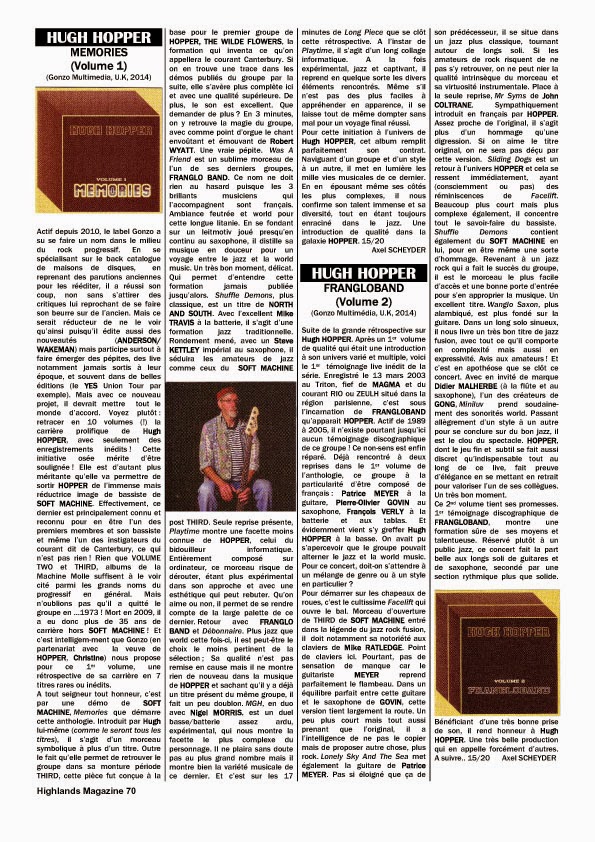 GONZO MULTIMEDIA - One of the key musicians from the dawn of late 1960’s progressive rock, the late great Hugh Hopper passed away in June 2009. Considered as a founding member of classic U.K. prog outfit Soft Machine, strangely enough replacing Kevin Ayers on bass in 1969, Hopper rose through the ranks and released a large body of work before his untimely passing. Fans of Hopper and Soft Machine can celebrate his work thanks to a voluminous body of work, encompassing over sixty different albums Hugh recorded with various bands and as a solo artist. Gonzo’s 10 CD series is appropriately entitled Dedicated To Hugh and the first two installments—Memories(Volume 1 - a cross section of tracks spanning Hopper’s career, starting in 1969) and Frangloband (Volume 2 - Live at The Triton Club, Paris 2004) were released in mid 2014. Each of these first two CDs is packed with detailed liner notes and rare pics of Hopper with a number of key bands and musicians. Memories features in depth interview and liner notes while Frangloband features more modest packaging including liner notes by Aymeric Leroy. Released by the great U.K. based label Gonzo Multimedia, each CD in the series was superbly compiled, edited and mastered by Michael King. Fans of Soft Machine as well as Hopper’s prodigious output in a number of bands will enjoy this in depth look into the archives of a real hero of U.K. prog-rock.